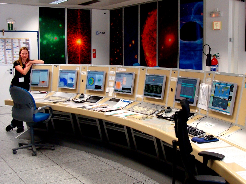 Und das hier ist der Kontrollraum – mittlerweile wird das meiste von Darmstadt aus gemacht, aber hier kann man live die Flugbahn von XMM auf den Bildschrimen sehen (das ist ein Weltraumteleskop, das ich haeufig benutze).