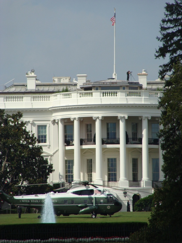 Genau. Hubschrauber! Konnte aber nicht erkennen, ob da jetzt die Obamas selber ankamen oder irgendwelcher wichtiger Besuch. Auf dem Dach vom Weissen Haus steht uebrigens ein Soldat mit Fernrohr.