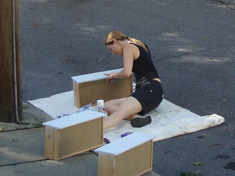 Dann hab ich die Aussenseiten mit so einem Whitewash getrichen, ich weiss nicht, wie man das auf deutsch nennt, das gibt so eine leichte Weiss-Faerbung, aber man kann die Maserung vom Holz noch sehen. Und die Schubladen hab ich in einem glaenzenden Vollweiss mit Spruehfarbe eingefaerbt. Diesmal aber mit farbsicherer Unterlage: