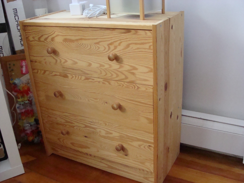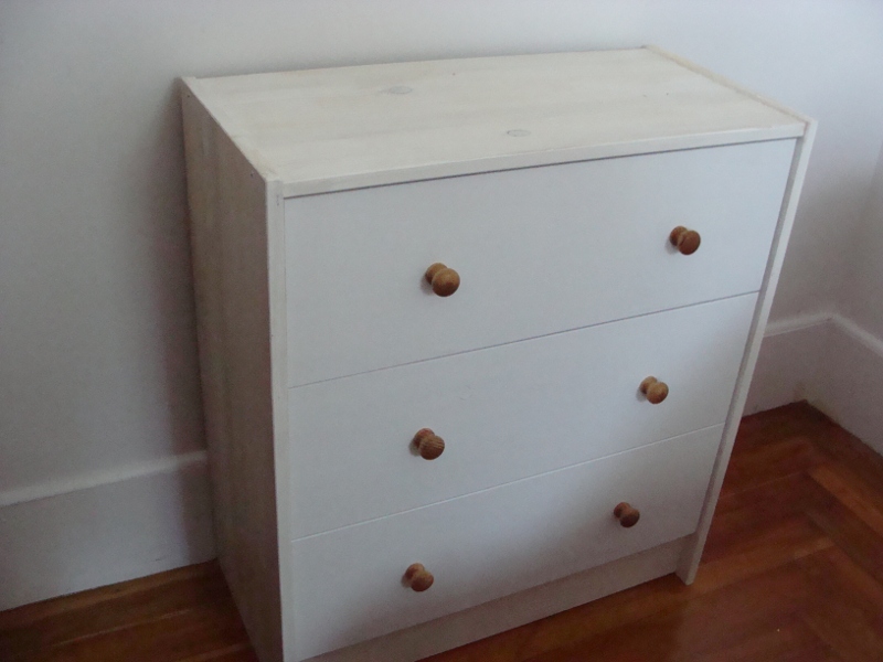 Nachdem mein erster Heimwerk-Versuch nur so mittelgut geklappt hatte (siehe hier), hab ich mich neulich nochmal an ein paar Sachen rangewagt. Groesstes Projekt bis jetzt: Eine Holzkommode streichen. So sah die vorher aus – quasi IKEA-Standard aus unbehandeltem Holz: