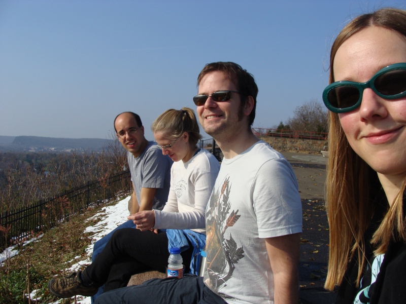 Also waren wir bei fruehlingsahnlichen Temperaturen letztes Wochenende in New Haven, um dort unsere Astrophysik-Freunde Elisabeth and Jon zu besuchen. Die beiden sind dort kuerzlich hingezogen, weil Jon eine Postdoc-Stelle in Yale bekommen hat. Das typische Postdoc-Schicksal… wobei die beiden es mit Fassung tragen. New Haven (= die Stadt, wo Yale liegt) ist eher kleinstaedtisch, aber man kommt mit dem Ueberlandbus immerhin in annehmbarer Zeit (zweieinhalb Stunden) nach Boston oder New York. Das hier sind wir alle beim Spaziergang durch Wald und Huegel: