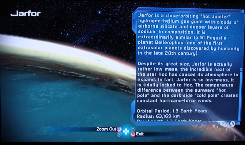 Eine Sache ist mir aber aufgefallen, die ich dann mal nachrechnen musste. Man stoesst irgendwann auf den Planeten Jarfor, der so beschrieben wird: “Jarfor ist ein ‘Hot Jupiter’-Gasplanet… sehr aehnlich dem Planeten um 51 Pegasi … der im spaeten 20. Jahrhundert von der Menschheit entdeckt wurde.”