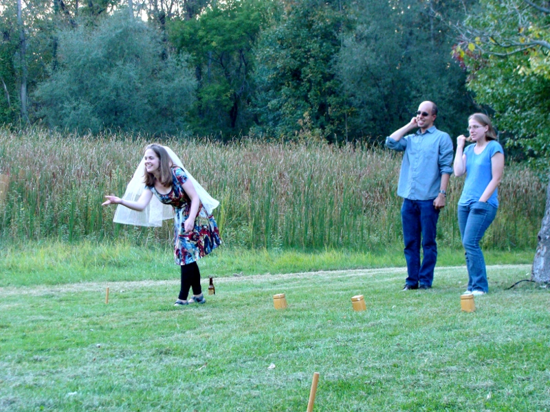 Und wieso das Ganze? Weil: unsere Freunde Moritz und Lauren haben dort geheiratet. Am Donnerstag, einen Tag vor der Hochzeit, haben wir Laurens Eltern besucht, die 200 Meter vom Lake Ontario entfernt wohnen. Da kann man einfach die Boeschung runterklettern, und schon kann man die Fuesse in den – echt riesigen – See halten: