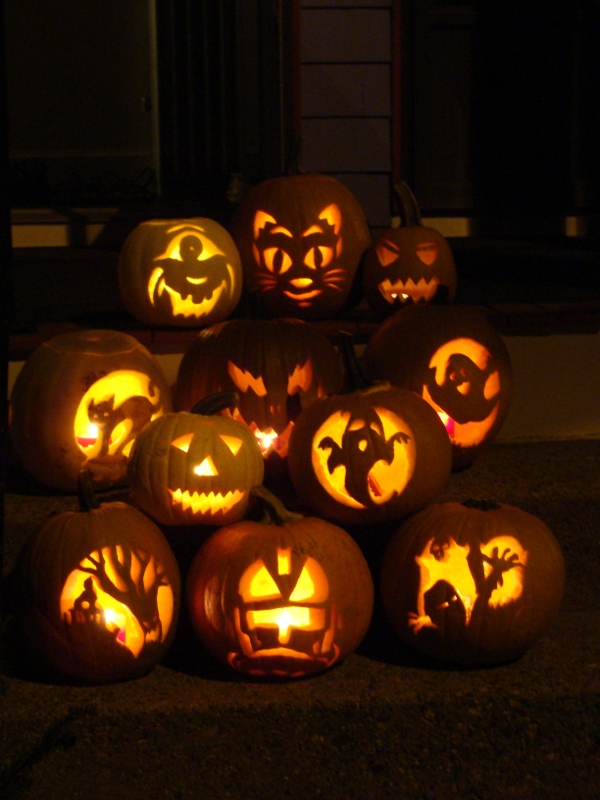 Sehr schoen geworden, finde ich. Unsere sind der mit dem Katzengesicht, und der kleine rechts daneben mit dem Halloweengesicht. Dann kann Halloween jetzt ja losgehen!