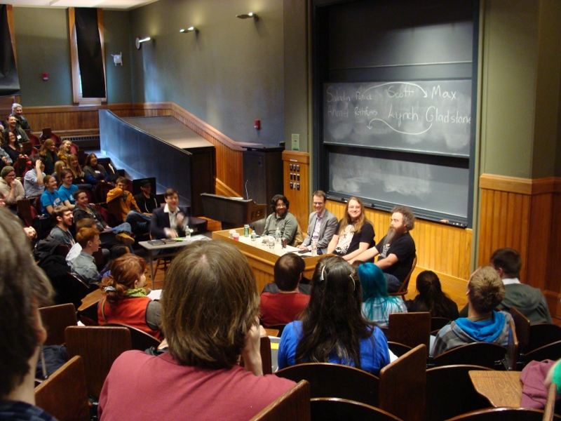 Letztens waren wir auf einer, ja, wie sagt man, auf einer Fantasy-Buch-Convention? So kann man es denke ich nennen. Eine kleine Convention auf dem Harvard-Campus, mit diversen Fantasy-Autoren, Brettspielen zum Ausprobieren und Diskussionsrunden. So sah das aus: