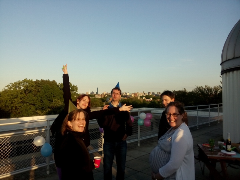 Gestern haben wir eine kleine Ueberraschungsparty auf dem Dach von meinem Institut veranstaltet. Unser Kumpel und Kollege Moritz hat naemlich nach langer Suche eine feste Wissenschaftlerstelle am MIT bekommen, als Softwaremensch fuer das Chandra-Weltraumteleskop. Yay! Da haben wir (also vor allem Lauren und Katie) Essen und Cider aufs Dach geschleppt und Luftballons bei gefuehlter Windstaerke 6 ans Gelaender gebunden. Hier Moritz (hat leider immer die Augen zu auf Fotos) und diverse Kollegen vor Cambridge/Boston-Skyline: