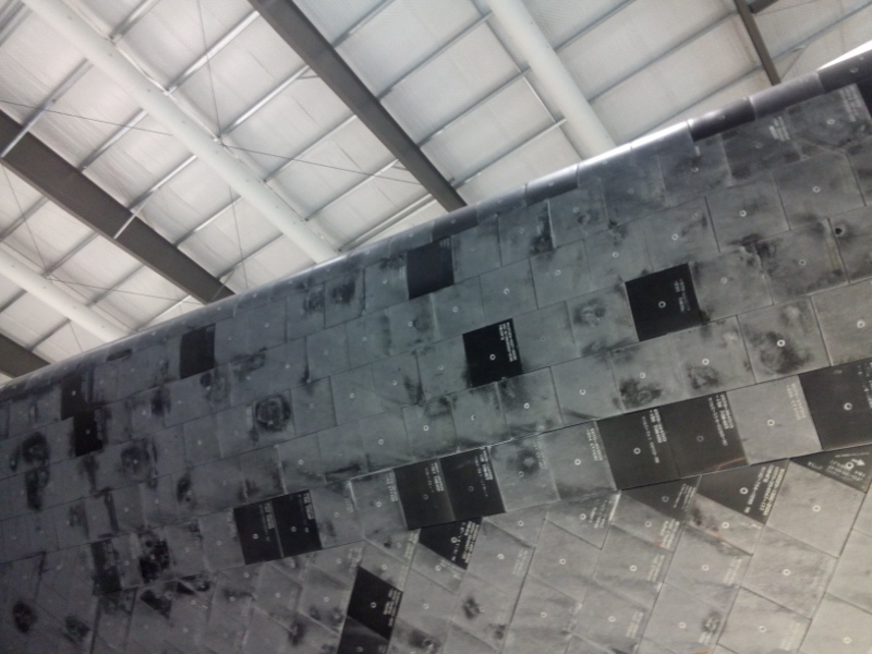 Und von unten, da sieht man die ganzen Hitzeschutzkacheln. Die sind alle numeriert, weil die alle leicht unterschiedliche Formen haben, damit es keine vorstehenden Kanten gibt:
