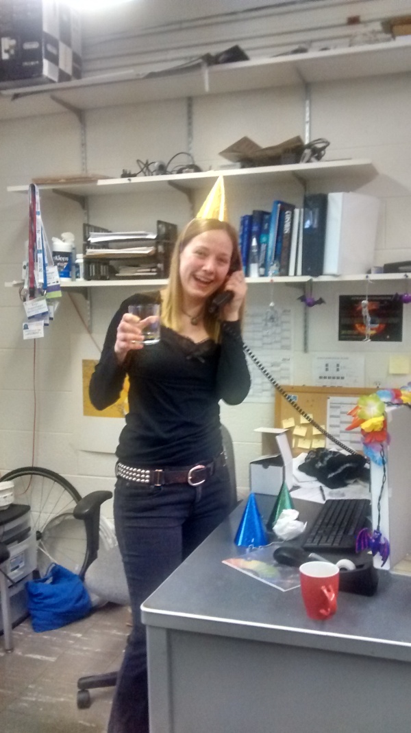 Letzten Freitag bekam ich dann eine Email, auf die ich mich mental schon lange vorher vorbereitet hab: ein Angebot! Endlich! Und zwar: von der Queen’s University Belfast! Wer haett’s gedacht! Die haben mir tatsaechlich doch noch die Lecturer-Stelle angeboten. Da muss wohl der Original-Wunschkandidat einen Rueckzieher gemacht haben. Tja, so kann’s gehen. Da hab ich dann erstmal vor dem Rechner gesessen und dreimal unglaeubig gesagt “Waaaaaa…?” Meine Kollegin Katie war schon ganz hibbelig und wollte endlich wissen, was los ist. Da hab ich ihr dann die Email vorgelesen, und dann haben wir Partyhuete aufgezogen und mit einem Whiskey darauf angestossen. (Ja, ich hab seit April 2014 Partyhuete und Whiskey in meinem Buero, fuer den Tag, wo ich endlich eine Professur bekomme.) Und dann hab ich Tobi und meine Eltern angerufen: