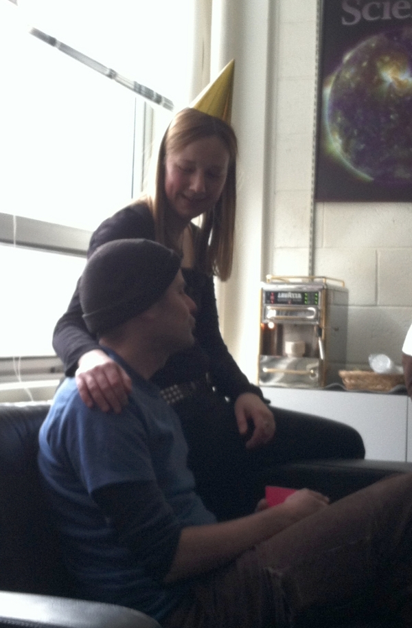 Huiiiii! Ein prima Tag! Dann bin ich zum Feinkostladen gegangen und hab Kuchen und Champagner geholt, die wir dann mit meinen Kollegen und Tobi zum Mittagessen verputzt haben. (Links von mir ist Scott, mein derzeitiger Mentor, und rechts Francesca.)