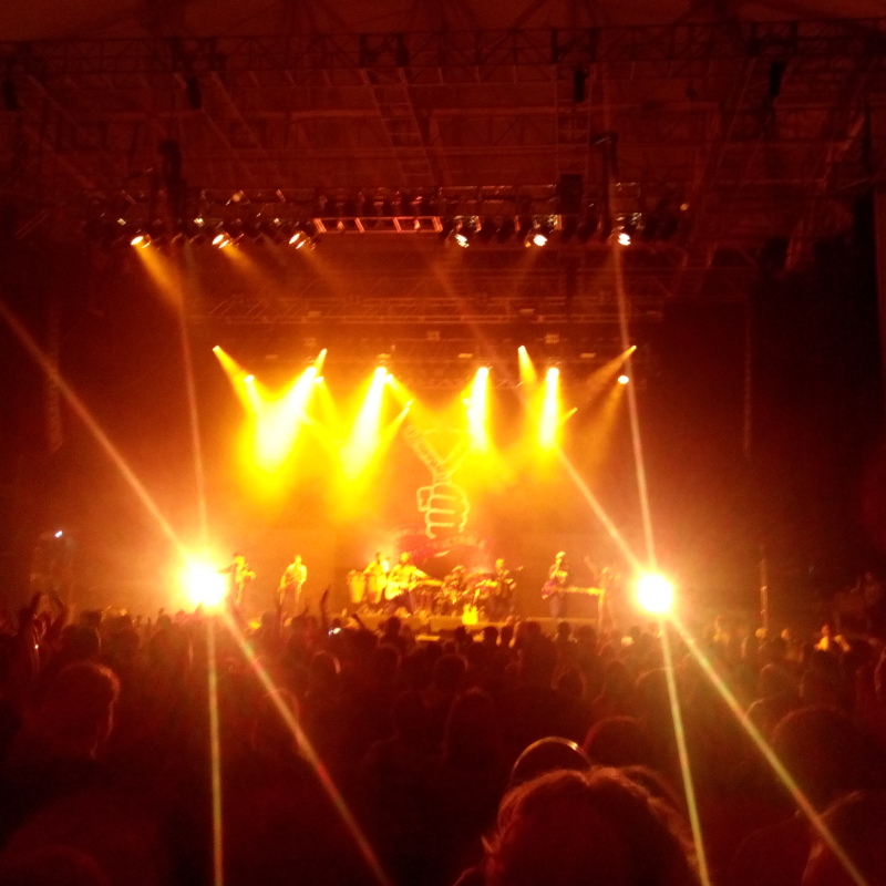 Und jetzt dieses Wochenende waren wir auf dem Flogging Molly Konzert, die Tobi und ich ja sehr prima finden (und von denen wir frueher mit unserer Band auch diverse Songs gecovert haben). Und als Vorband: Gogol Bordello! Die ich ja auch sehr gerne mag. Und als Vor-Vorband noch eine Gruppe namens Mariachi El Bronx – die haben echt einen harten Job gut erledigt, denn die waren so frueh dran, dass alle Zuschauer noch am Wasser sitzen und Bier trinken wollten. Jedenfalls, Flogging Molly waren konstant sehr gut: