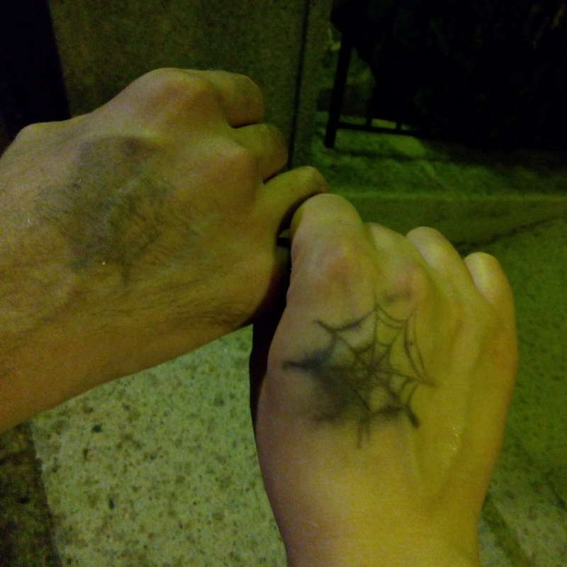 Letztes Wochenende waren wir bei Xmortis, das ist die Gothic-Party in unserer Lieblingsdisco T.T. The Bear. Drinnen war es ungefaehr 38 Grad, und zumindest der Eintritt-Stempel von Tobi war schon nach einer halben Stunde ausgeschwirtzt: