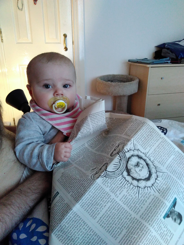 Kara hat gemerkt, dass Zeitung schoene Knittergeraeusche macht. Was das Zeitunglesen im Bett schwieriger macht, aber es ist dafuer sehr niedlich: