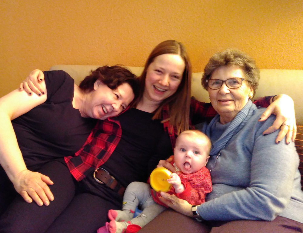Mitte Januar waren wir in Langen bei meiner Mama zu Besuch. Am Wochenende sind auch meine Oma Thea, und mein Onkel Udo und seine Freundin Anke zu Besuch gekommen. Kara hat sich ganz prima bespielen lassen von allen. Hier ein Vier-Generationen-Frauen-Foto: