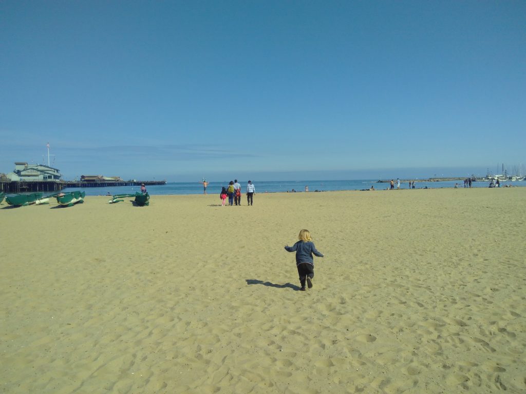 Wenn man ein paar Minuten an der Kueste entlanggeht, kommt man zum Goleta Beach. Kara hat richtig viel Spass, da im nassen Sand zu spielen. Wobei der Pazifik so kalt ist, dass sich keiner von uns weiter als bis zum Knie reingetraut hat.
