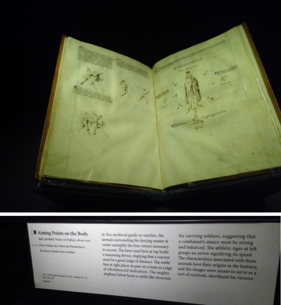 Im Getty Museum habe ich komplett unerwartet ein Original mittelelterliches Fechtbuch gesehen! Fiore, italinisches Langschwert. Nicht ganz das, was ich mache, aber gleiche Zeitperiode. Sehr cool.