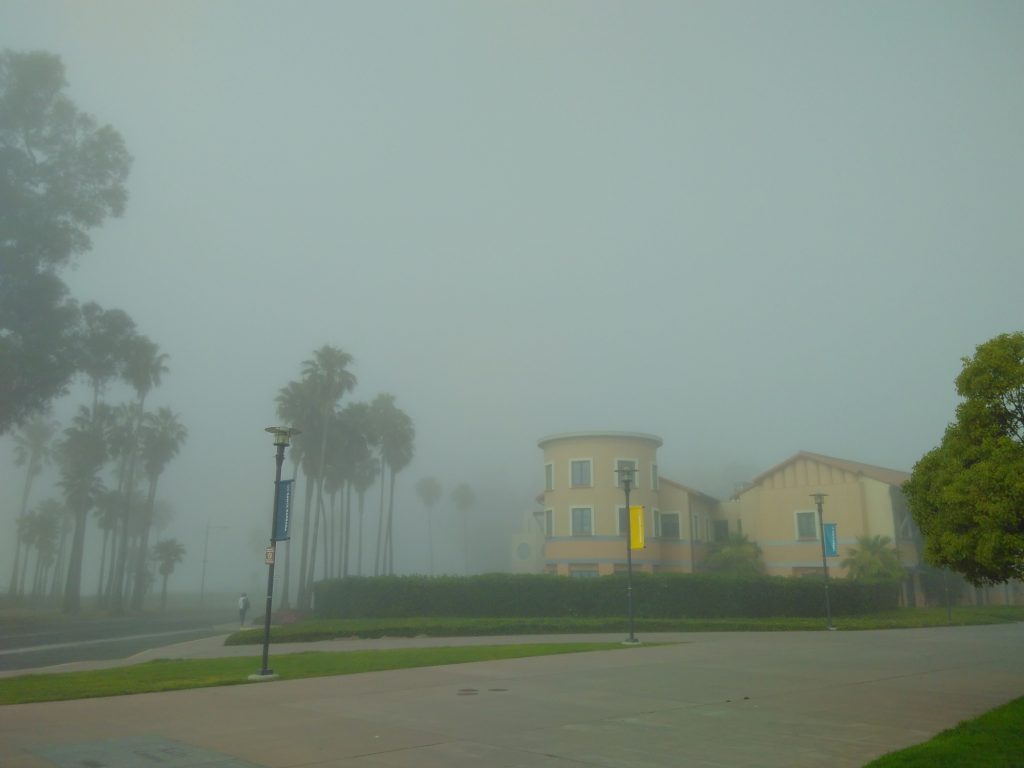 Allerdings ist das Wetter ziemlich durchwachsen – wir haben zwar oft Sonne, aber zwischendurch ist hier der “June Gloom” am Start, wo richtig dicker Nebel vom Ozean aufzieht und die ganze Kueste ueberdeckt. So sieht mein Institut aus, wenn es nebelt: