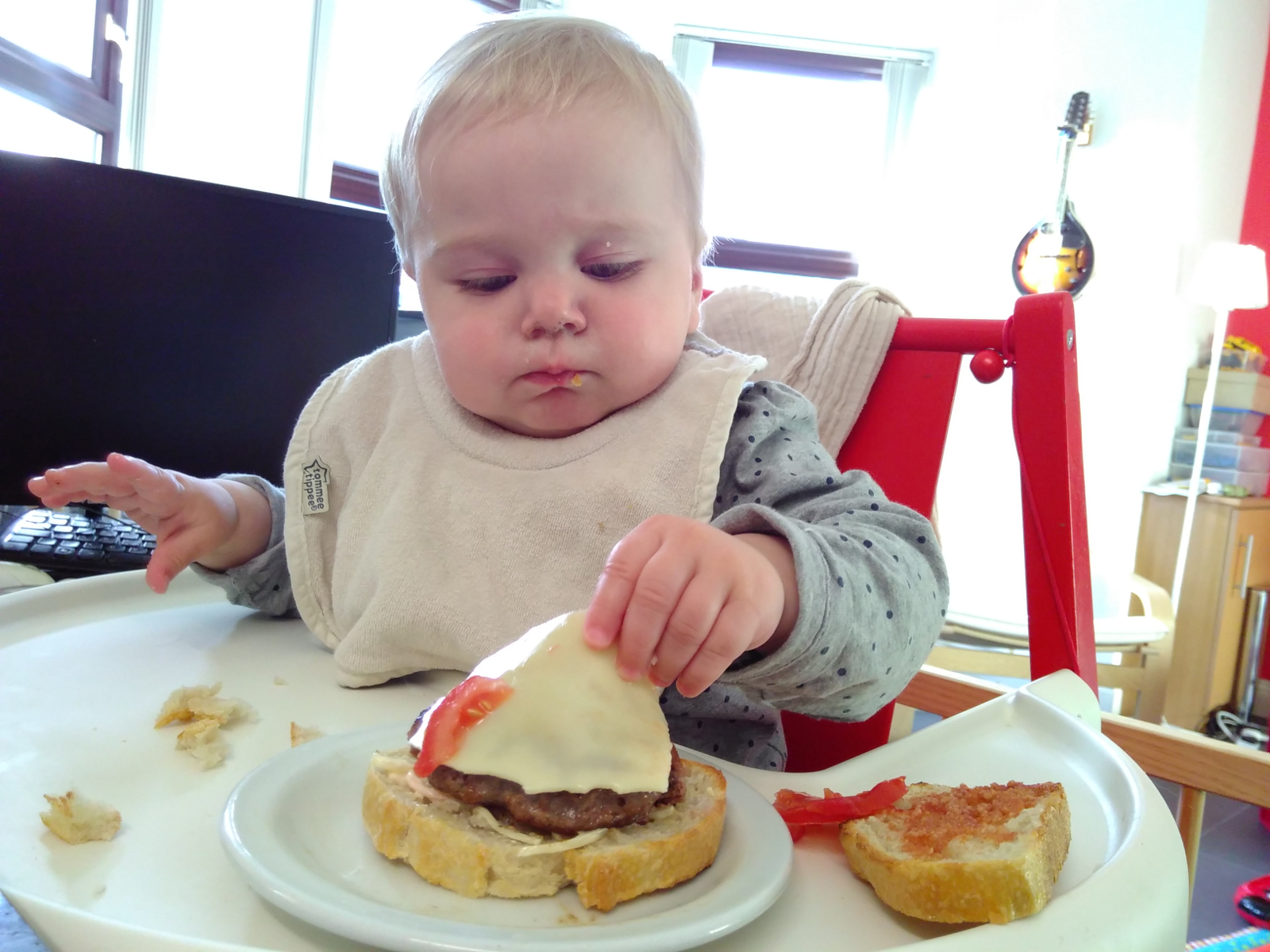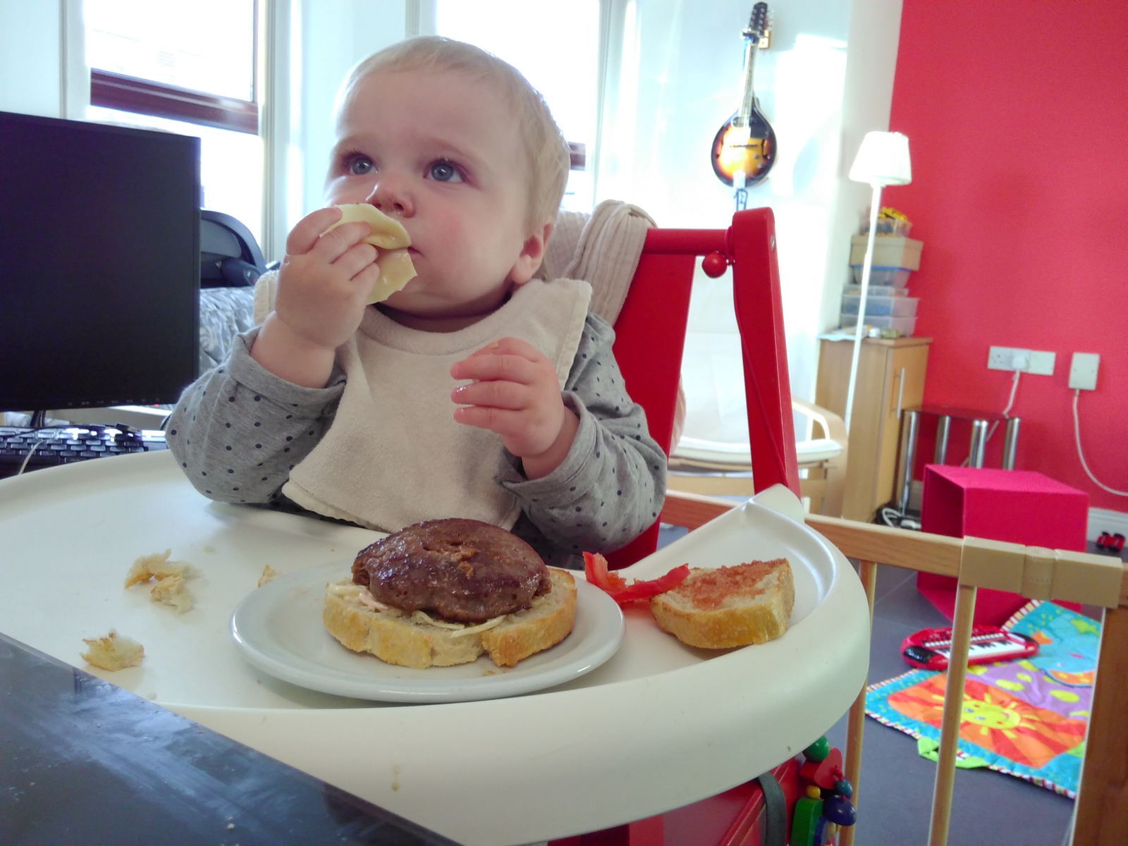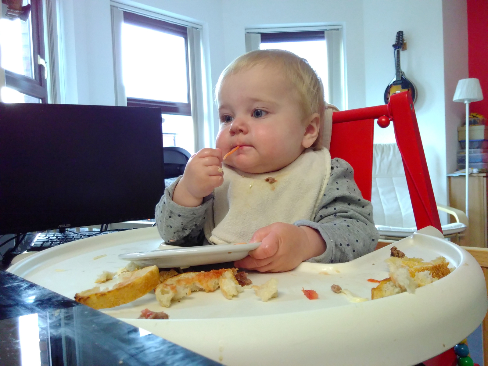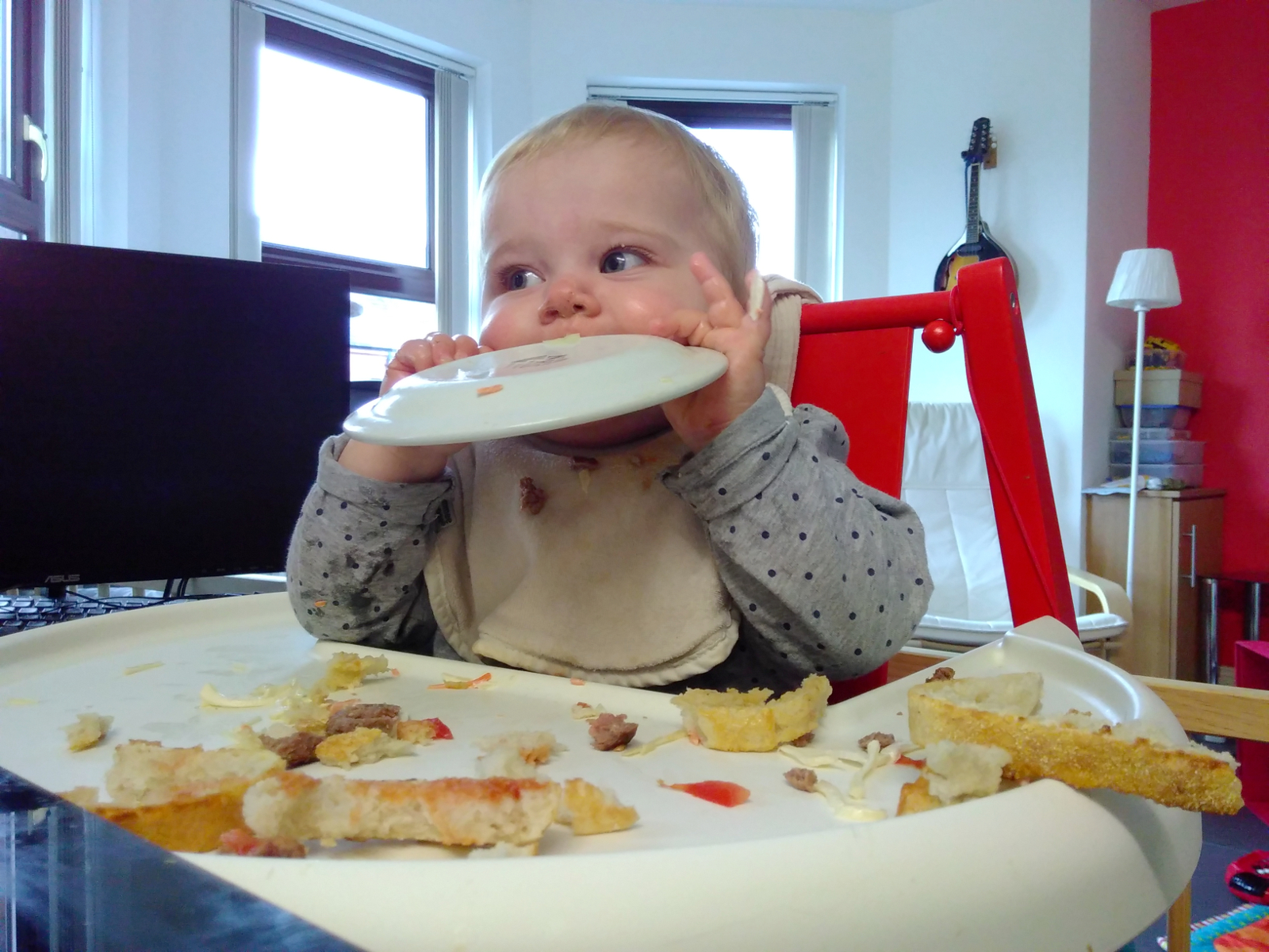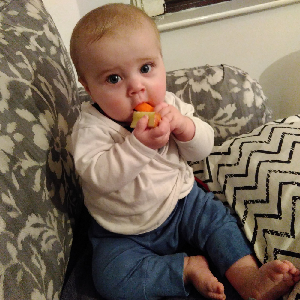 Was war sonst so? Kara “isst” jetzt gerne die Sachen, die wir auch essen. Heisst, sie steckt sie in den Mund, speilt damit, und spuckt sie wieder aus. Aber es macht ihr Spass:
